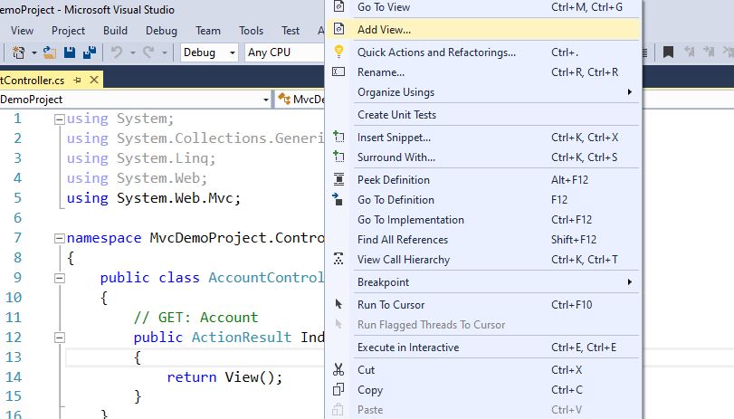 Step 4-Now Let’s create an action method in both controllers , I have created one action method in HomeController and six Action Method in AccountController.